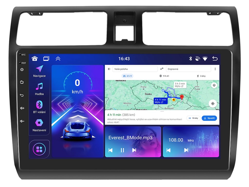 Zažijte každý okamžik ve vaší Suzuki Swift s neuvěřitelným zvukem díky 2DIN autorádiu Bmode BEV57. Na první pohled upoutá moderní technologie CarPlay a AndroidAuto, které umožňují bezproblémové zrcadlení a ovládání telefonu na displeji autorádia. Jeho 10,1 palcová dotyková obrazovka zachycuje každý detail v HD rozlišení, což potěší spolucestující při cestování. Vysoký výkon zajistí čtyřjádrový procesor s podporou 4 GB RAM. Náročný posluchač jistě ocení funkci DSP neboli digitální signálový procesor, který násobně zvyšuje kvalitu reprodukce. Funkce Bluetooth umožní pohodlné a bezpečné handsfree volání a vyřizování důležitých hovorů. Pokud si občas nevíte rady se správnou cestou, můžete využít zabudovaného GPS modulu, který Vás přivede na tu správnou cestu. Pomocí Google obchodu si můžete stáhnout svou oblíbenou GPS navigaci. Operační systém Android 13 se postará o ovládání mnoha oblíbených aplikací. Pro bezpečné couvání můžete snadno propojit autorádio s parkovací kamerou. Autorádio nabízí možnost výběru z různých jazyků, které obsahují přeloženou základní část systému do českého jazyka.