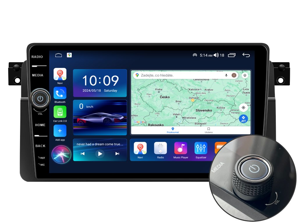 2DIN autorádio Everest EVE12 pro BMW E46 nastavuje nové standardy ve světě multimediálních technologií. Na první pohled zaujme svou 9 palcovou QLED obrazovkou s neuvěřitelným rozlišením 1280 x 800. Lze na ní sledovat video i prohlížet fotografie s podporou Android aplikacemi. O špičkový výkon a plynulý běh aplikací se stará stabilní software s 8-jádrovým procesorem ve spolupráci se 6 GB RAM. Náročný posluchač jistě ocení funkci DSP neboli digitální signálový procesor, který násobně zvyšuje kvalitu reprodukce. Za pomocí 4G modulu se z Vašeho autorádia stane smartphone, ze kterého můžete hravě odesílat SMS zprávy, využívat online GPS navigaci s aktuální dopravní situací či využívat další cenné funkce. Váš mobilní telefon již zůstane navždy v kapse díky bezdrátové funkci CarPlay a Android Auto. Díky operačnímu systému Android 14 budete mít ve svém automobilu kompletní multimediální centrum přeplněné funkcemi a aplikacemi. Pohled z parkovací kamery Vám umožní bezpečné a ničím nerušené couvání. Autorádio nabízí možnost výběru z různých jazyků, které obsahují přeloženou základní část systému do českého jazyka.