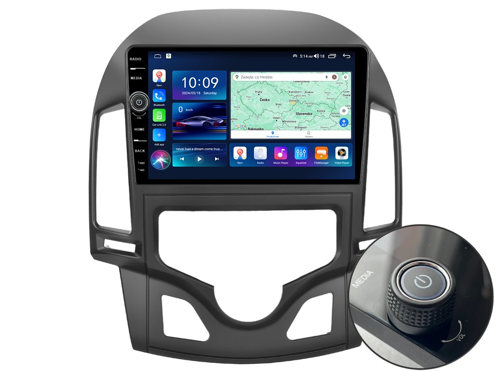 2DIN autorádio Everest EVE31 pro Hyundai i30 nastavuje nové standardy ve světě multimediálních technologií. Na první pohled zaujme svou 9 palcovou QLED obrazovkou s neuvěřitelným rozlišením 1280 x 800. Lze na ní sledovat video i prohlížet fotografie s podporou Android aplikacemi. O špičkový výkon a plynulý běh aplikací se stará stabilní software s 8-jádrovým procesorem ve spolupráci se 6 GB RAM. Náročný posluchač jistě ocení funkci DSP neboli digitální signálový procesor, který násobně zvyšuje kvalitu reprodukce. Za pomocí 4G modulu se z Vašeho autorádia stane smartphone, ze kterého můžete hravě odesílat SMS zprávy, využívat online GPS navigaci s aktuální dopravní situací či využívat další cenné funkce. Váš mobilní telefon již zůstane navždy v kapse díky bezdrátové funkci CarPlay a Android Auto. Díky operačnímu systému Android 14 budete mít ve svém automobilu kompletní multimediální centrum přeplněné funkcemi a aplikacemi. Pohled z parkovací kamery Vám umožní bezpečné a ničím nerušené couvání. Autorádio nabízí možnost výběru z různých jazyků, které obsahují přeloženou základní část systému do českého jazyka.